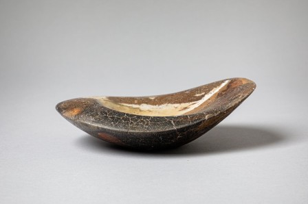 19 . Cuivre saturé enfumé et poli après cuisson .1000° four gaz/bois. 30 cm. Le craquelage est obtenu en posant une terre humide sur une terre sèche Enfumage 1000°.